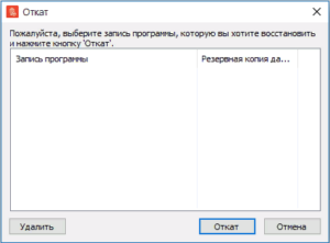 Если у вас есть резервные копии ранее удалённых программ, то они отобразятся в открывшемся окошке. Выберите нужную копию и нажмите на кнопку «Откат».
